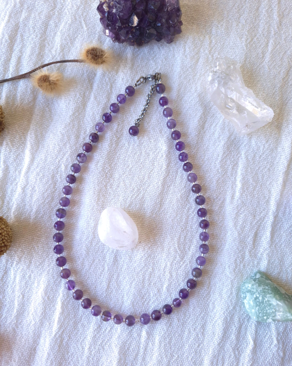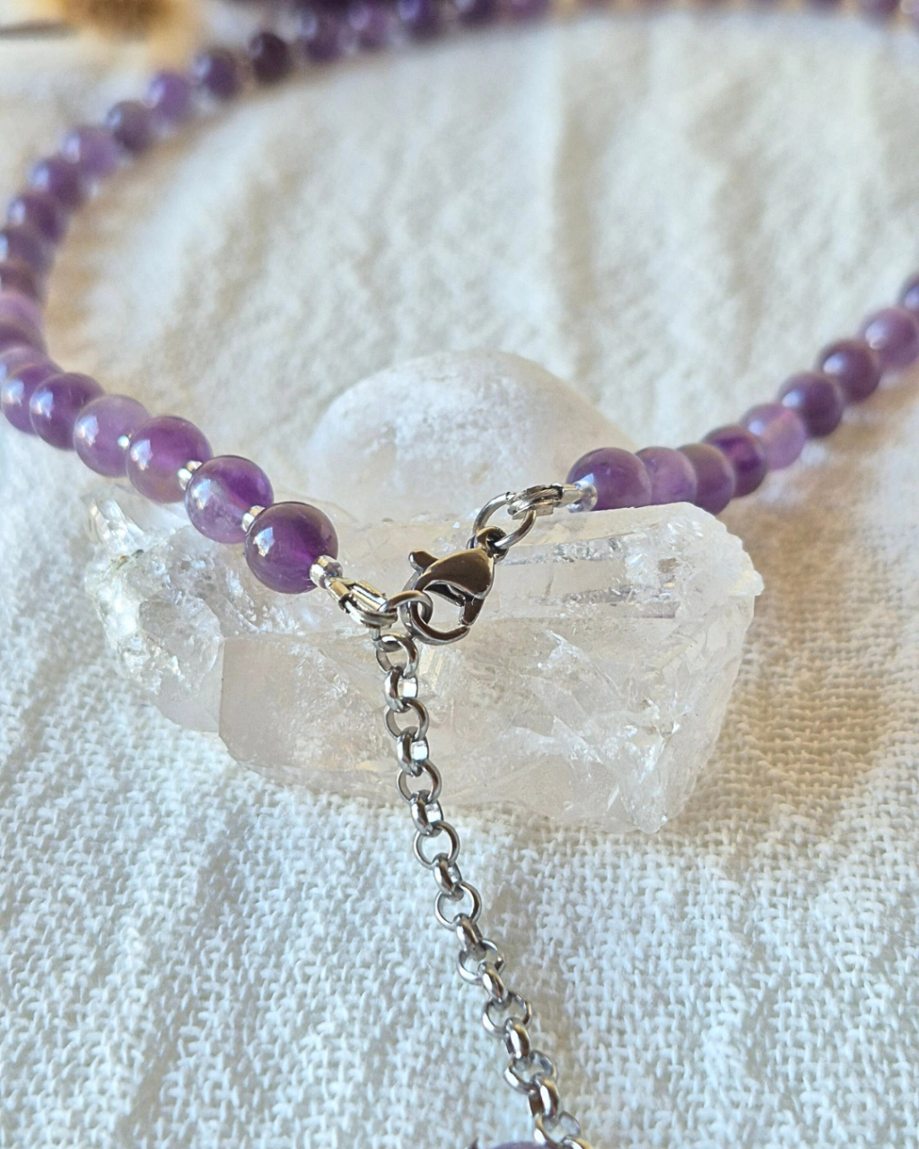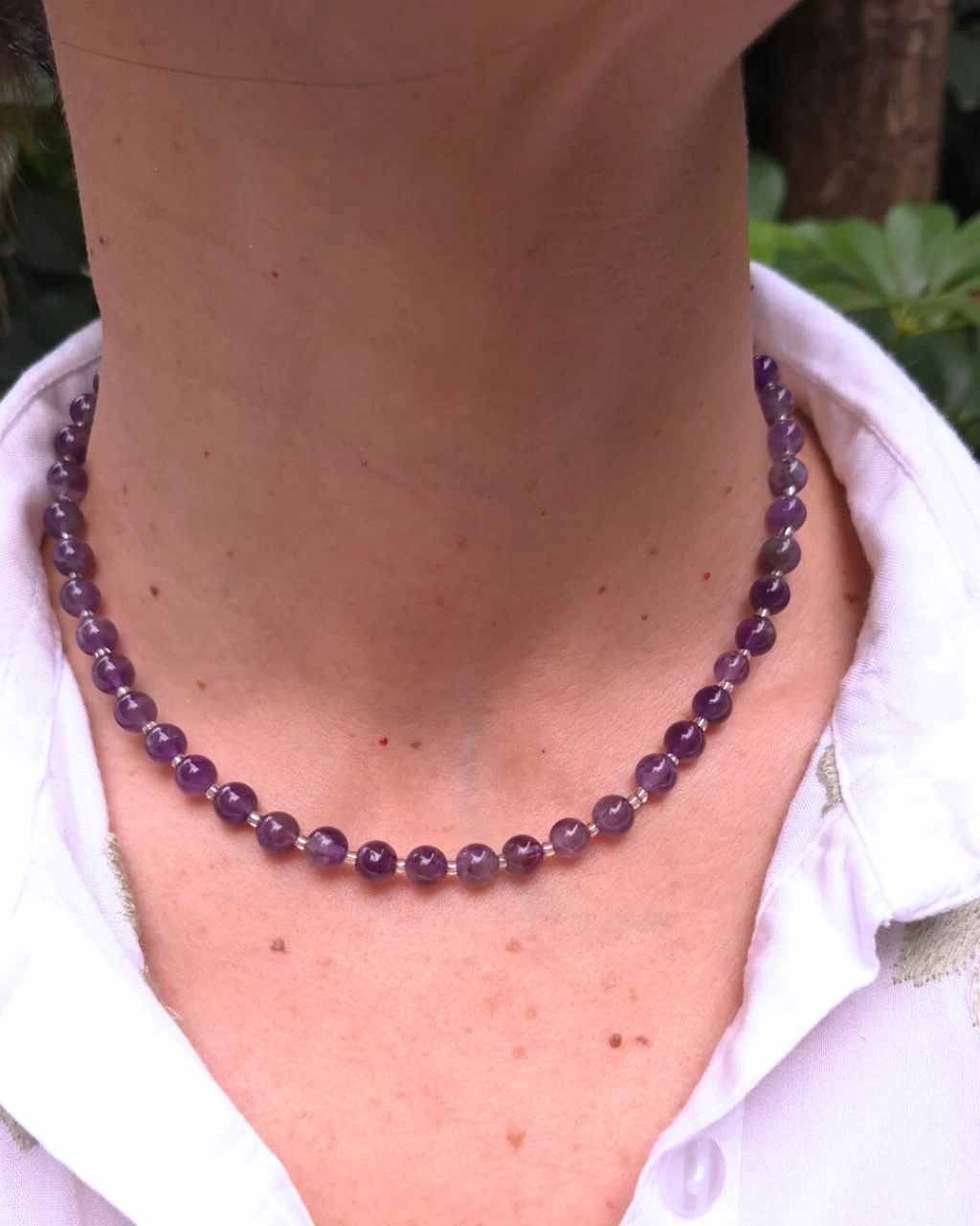 Especificaciones: Collar de 40 cm. (extensible hasta 45 cm.) piedras naturales Amatista de 6 mm, cierre de acero con cadena extensible de 5 cm. Si querés que tu cadena de extensión sea mas larga, al momento de la compra nos avisás.