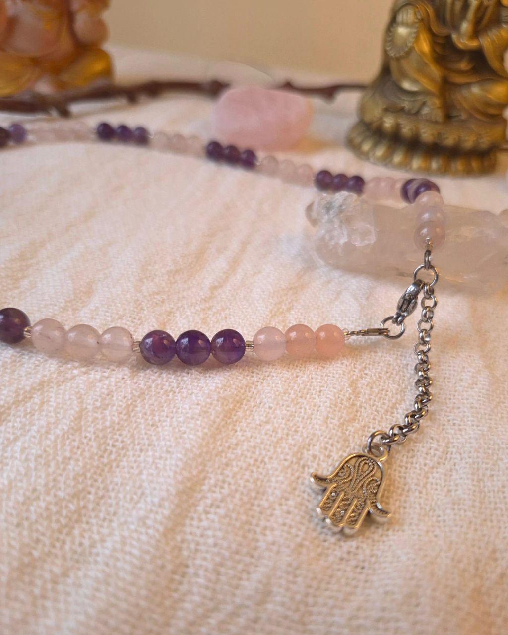 Especificaciones: Collar de 40 cm. (extensible hasta 45 cm.) piedras naturales de Cuarzo Rosa y Amatista de 6 mm, dije metálico de Hamsa, cierre de acero con cadena extensible de 5 cm,