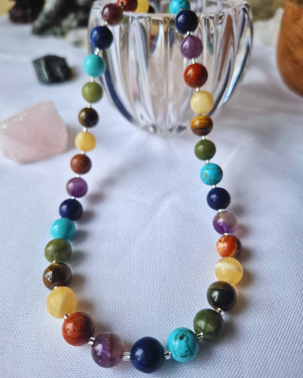 Piedras naturales en tonos vivos y coloridos, diseñadas para acompañar el equilibrio de los siete chakras. Alegre y primaveral, combina energía, belleza y simbolismo.