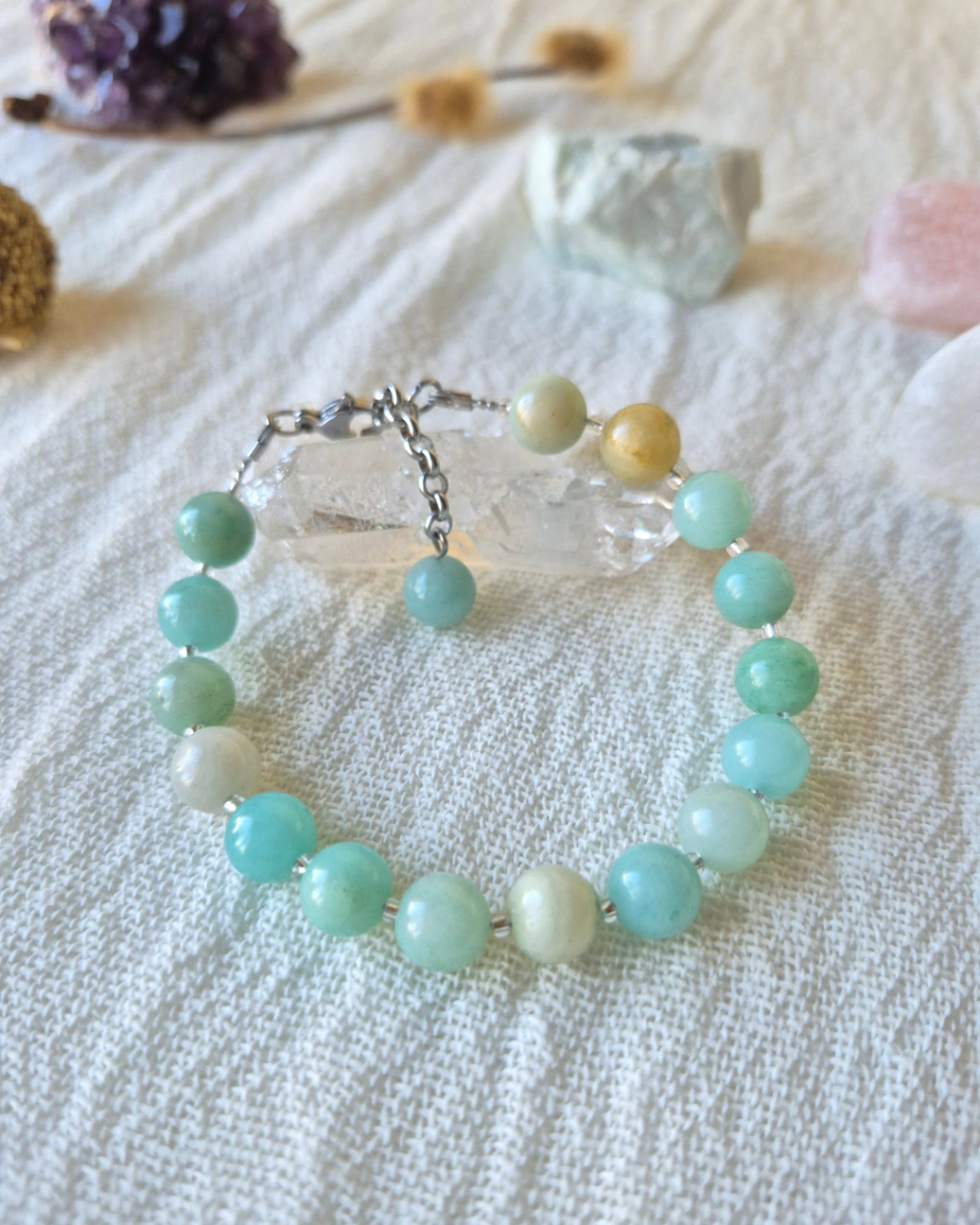 Pulsera de cuentas de Amazonita natural de 8 mm, armada con cierre y cadena de extensión de acero quirúrgico (3 cm).