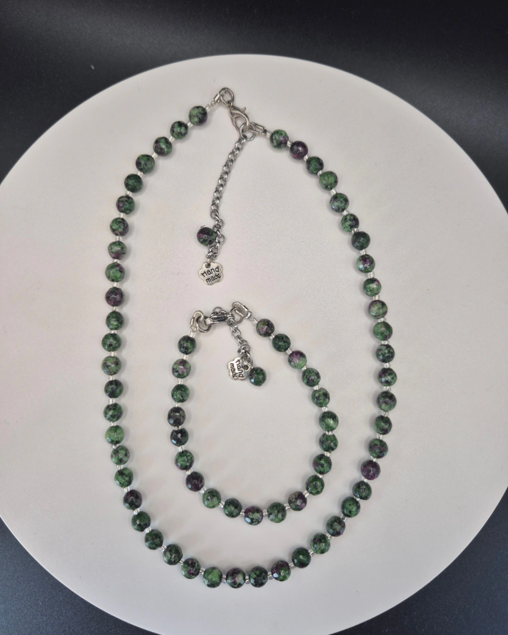 Pulsera de cuentas de 6 mm de Rubí en Zoisita, cierre y extensión de cadena de acero para un ajuste cómodo y seguro.