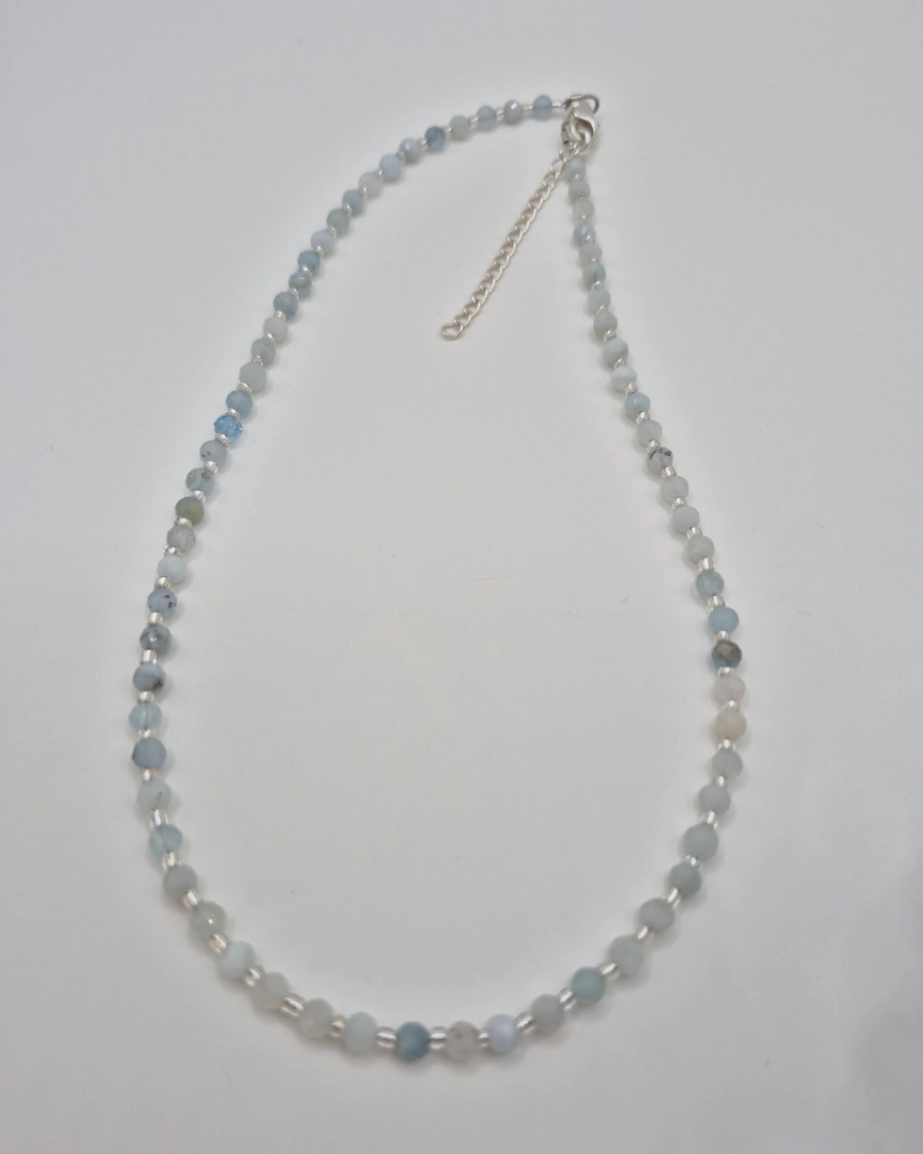 Gargantilla compuesta por Cuentas milimetradas y facetadas de Aguamarina. Cierre y cadena de extensión en Plata 925.
