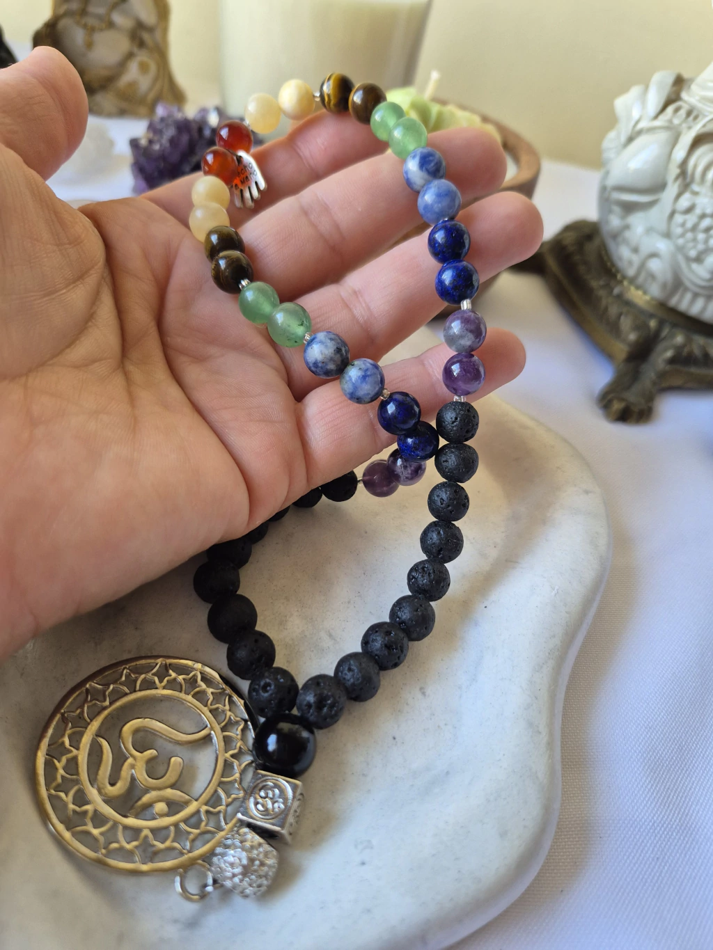Especificaciones: cuentas naturales de 8 mm, punto de inicio con Ágata Negra, dijes metálicos Om.