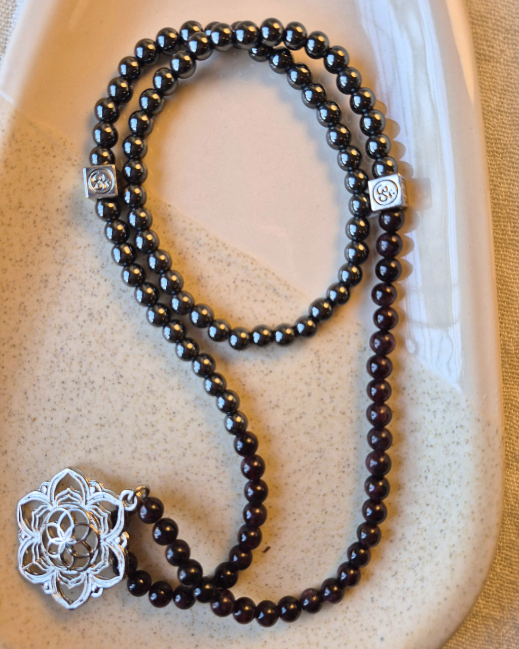 Este Japa Mala está diseñado para fortalecer el enraizamiento, la presencia y el poder interno. Combinando la estructura del Hematite con la fuerza vital del Granate, es ideal para momentos de transformación, enfoque o necesidad de sostén interno. El dije de Flor de la Vida, símbolo sagrado de expansión y unidad, potencia su vibración energética.