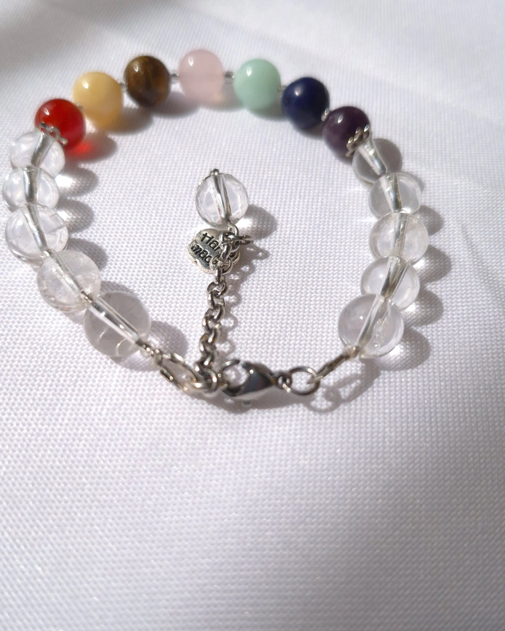 el Cuarzo cristal funciona como amplificador y ordenador energético, realzando la vibración de las cuentas de los 7 chakras para acompañar el día con lucidez, apertura y foco.