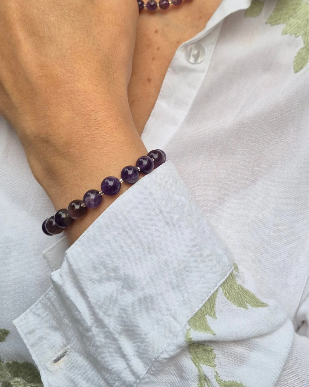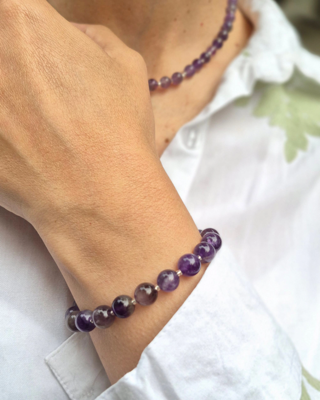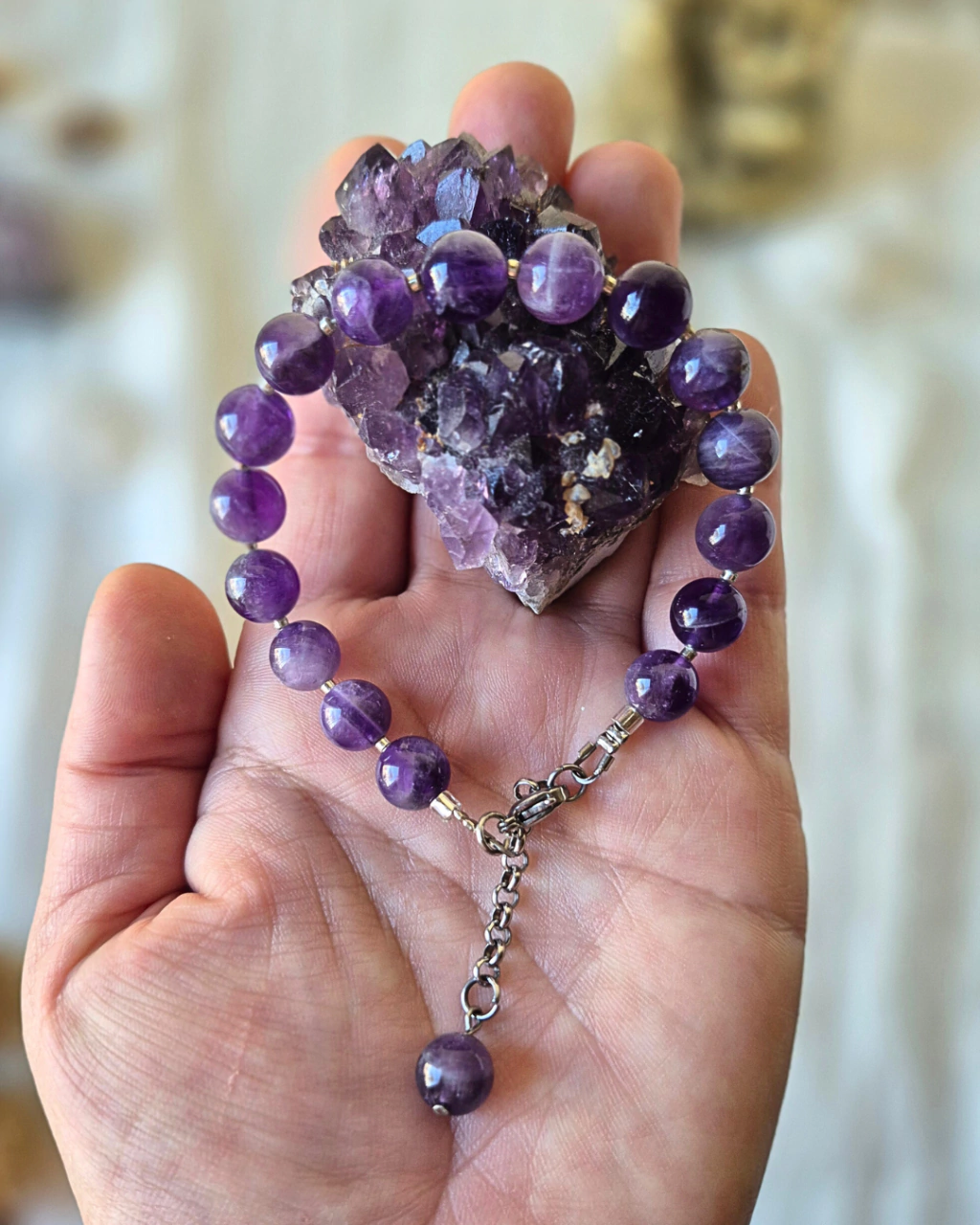 Especificaciones: compuesta por bolitas de 8 mm de amatista natural, cierre y extensión de cadena de acero para un ajuste cómodo y seguro.