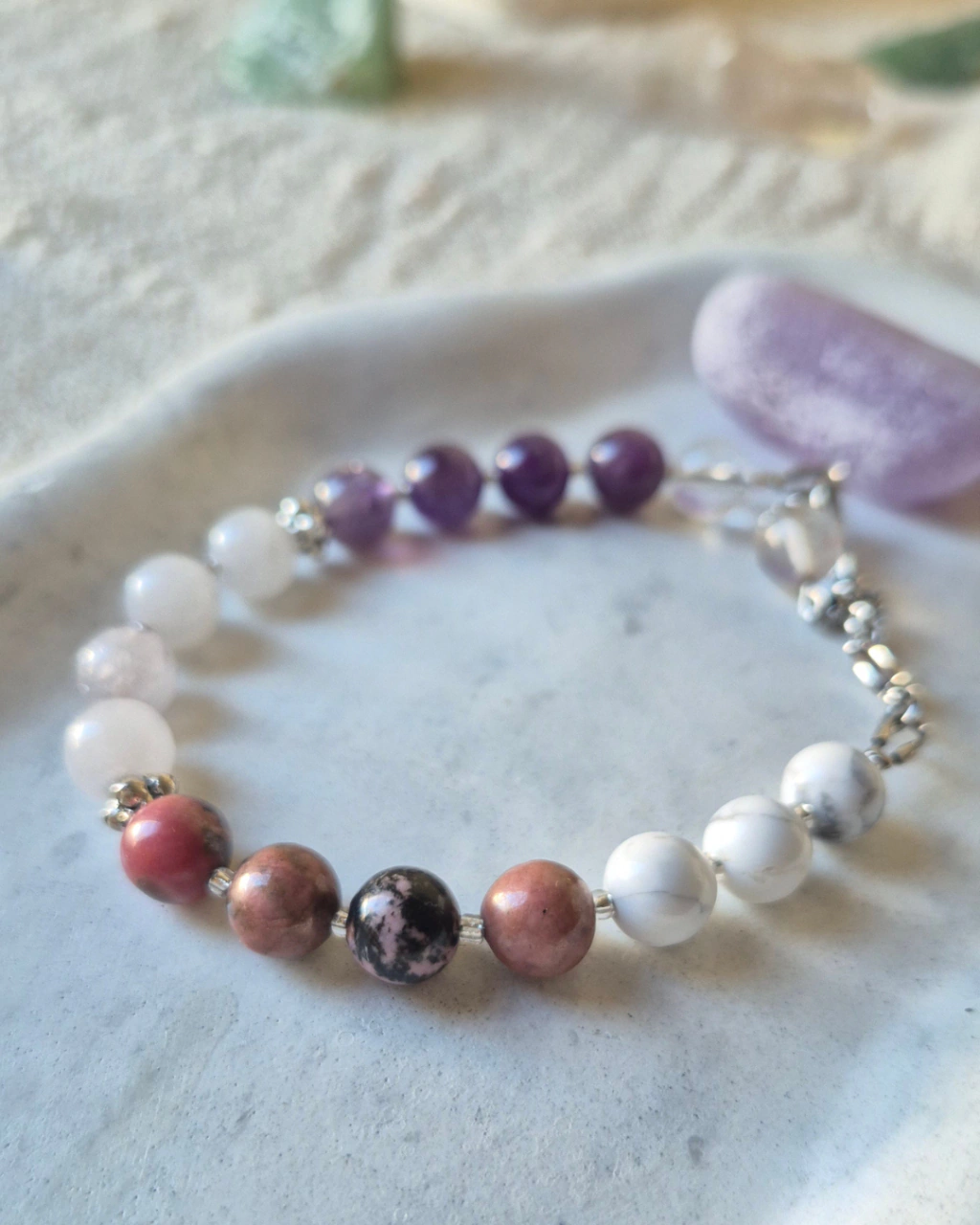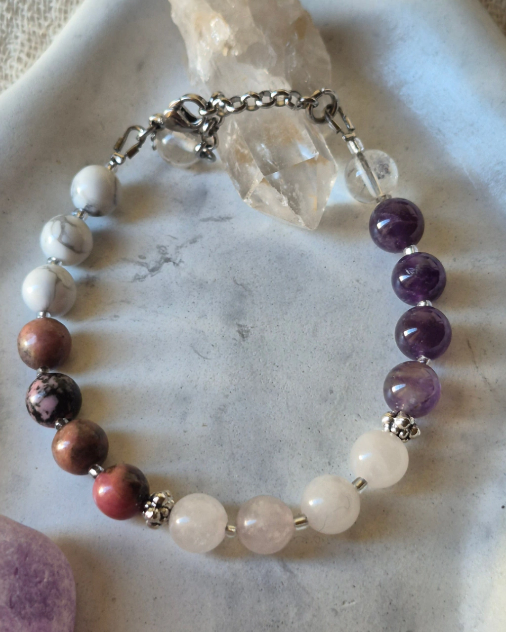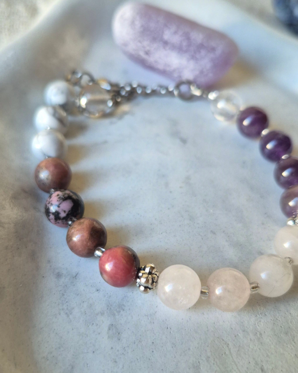 Una pieza que une la sabiduría espiritual con la fuerza del amor. Sus piedras fueron seleccionadas para emular el puente entre el chakra corona y el chakra corazón, recordándote que la verdadera plenitud surge cuando la mente y el alma se alinean con la compasión.
